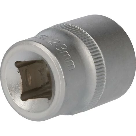 La douille 6 pans BRILLIANT TOOLS BT022814 est fabriquée selon la norme DIN 3124. L’insert métrique court a un entraînement carré 1/2″ (12,5 mm) fabriqué selon la norme DIN 3120. La taille de clé du six pans est 23 mm. La douille a une longueur totale de 38 mm. La surface est chromée mate sur le côté entraînement et sur le côté six pans creux, elle est séparée par un moletage droit.