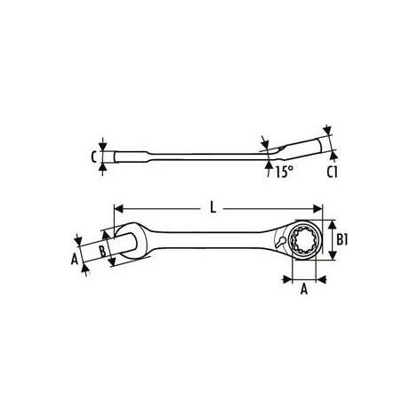 • Normes : ISO 691 – ISO 1711-1• Angle de reprise 5°.• Tête polygonale à cliquet 12 pans coudée à 15°.• Changement de sens par inverseur encastré et protégé.• Fourche orientée à 15° par rapport à l`axe du manche (angle de reprise 30°).