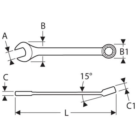 - Extrémité ouverte coudée à 15 ° de l’axe de la poignée.