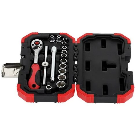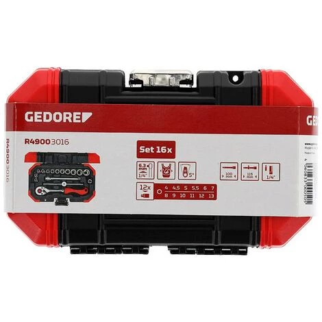 - Connexion 4 pans creux selon DIN 3120 – A 6,3, ISO 1174, avec blocage à bille Entraînement 4 pans creux conforme à DIN 3120-C 6,3, ISO 1174, avec gorge à billes 2K-cliquet réversible 1/4, rotation droite / gauche commutable par levier, bouton de déclenchement, denture fine, à tête ovale, poignée à 2 composants, transmission de force en douceur, pour embouts de clé à douille Douille 1/4, 6 pans, métrique, court, modèle conforme à la norme DIN 3124, ISO 2725 Rallonge de clé à douille 1/4 Poignée en T avec pièce coulissante 1/4, modèle conforme à la norme DIN ISO 3315 Adaptateur d’embout 1/4, avec six pans creux et 4 pans creux, pour tous les outils et les embouts avec six pans extérieur 1/4 Acier chrome-vanadium, chromé mat satiné Commande manuelle pour travaux de vissage Coffret en plastique au design GEDORE red Serrage des outils sécurisée Charnières métalliques et fermeture Ce texte a été traduit par une machine.
