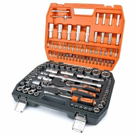 Ce coffret de douilles 108 pièces qualité professionnelle est composé de différents embouts et douilles, clés, cliquet et porte-douille. Complet, pratique et robuste avec une fermeture métallique, il est garantie à vie. Il sera idéal pour compléter votre caisse d’outils pour tous vos travaux quotidiens.