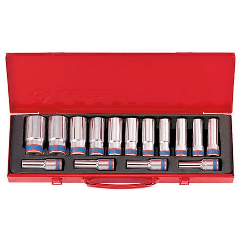 Coffret métallique. Douilles longues 12 Pans : 10 – 11 – 12 – 13 – 14 – 15 – 16 – 17 – 19 – 21 – 22 – 24 – 27 – 30 – 32 mm.