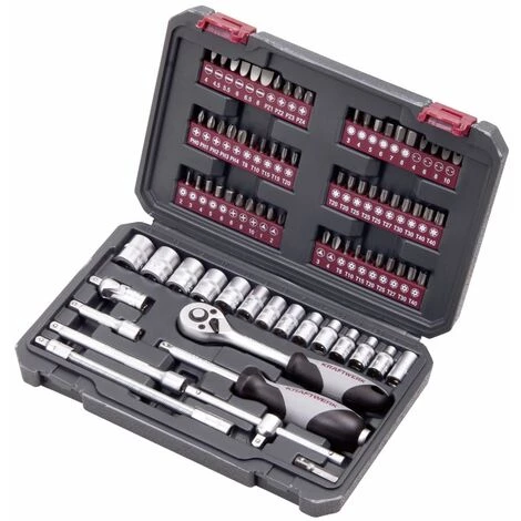 Kraftwerk Jeu de douilles, 1/4 », 82 pcs Kraftwerk 204101001 1/4 pouce Clé et morsure de socket Set 82 Partie avec grand choix d’inserts de bits pour presque tous les profils de vis Les bits sont branchés sur des bandes amovibles