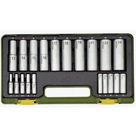 L’ensemble de la clé à lit profonde Proxxon, 1/4 + 1/2, est disponible dans un boîtier en plastique compact avec fermeture à pression et insert stable. Avec 1/4 carré en voiture (pour 1/4 cliquet; Couples de serrage ici en dessous de 25 nm): inserts hexagonaux pour 4 – 5 – 5,5 – 6 – 7 – 8 – 9 – 10 – 11 et 12 mm. Avec 1/2 carré en voiture (pour 1/2 cliquet; Couples de serrage d’ici au-dessus de 25 nm): 13 – 14 – 15 – 16 – 17 – 18 – 19 – 21 – 22 et 24 mm. Toutes les pièces mate chromées. Les valeurs de dureté et de couple maximum sont mieux demandées que DIN / ISO. Le niveau dimensionnel est dans les tolérances approuvées. Une table pour les fils de M 1.6 – M 24 avec des couples de serrage est fixée de manière permanente sur le couvercle. 1/2 noix de lit profond (longueur 79 mm) inserts hexagonaux pour 13 – 14 – 15 – 16 – 17 – 18 – 19 – 21 – 22 et 24 mm.; Noix de lit 1/4 profondes (longueur 50 mm) Inserts hexagonaux pour SW 4 – 5 – 5,5 – 6 – 7 – 8 – 9 – 10 – 11 et 12 mm • Clé de douille spéciale avec inserts de lit profond • Toutes les pièces mate chromées et marqué bien lisible • fourni dans le boîtier en plastique compact avec insert stable