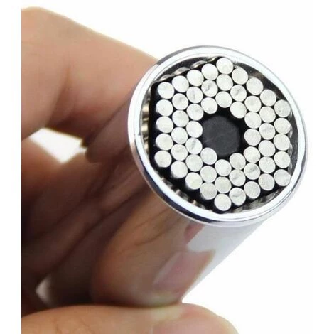 La douille universelle dispose de 54 broches mobile en acier aussi puissantes qu’une machoire s’adaptent à toutes les formes. Elles s’ajustent instantanément à toute forme (pour toute forme parfaitement ronde limer sur un des côtés). Aucun réglage, il suffit de presser et tourner.