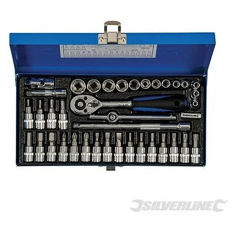 En acier chrome-vanadium poli. Poignée à cliquet double densité à dégagement rapide. Comprend 1 cardan et 2 rallonges de 50 et 150 mm. Barre coulissante en T. 13 douilles : 4 ; 4,5 ; 5;5 , 6, 7, 8, 9, 10, 11, 12, 13 et 14 mm ; 3 douilles tournevis plat : 4, 5,5 et 6,5 mm ; 3 douilles tournevis PZD : Nos 1, 2 et 3; 7 douilles tournevis Trx : T10, T15, T20, T25, T27, T30 et T40 ; 7 douilles clé hex : 2,5, 3, 4, 5, 6, 8 et 10 mm ; 2 rallonges 50 x 150 mm.
