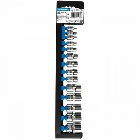 Douilles Trx EX en chrome-vanadium poli avec carré conducteur. Le jeu comprend douilles 1/4′ : E4, E5, E6, E7, E8 douilles 3/8′ : E10, E11, E12, E14 douilles 1/2′ : E16, E18, E20, E22 et E24.