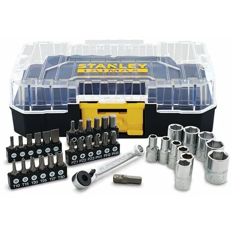 - COMPLÈTE avec 1 Clé Cliquet 1/4″ + 11 Douilles 1/4″ FATMAX (6 pans) avec moletage (X-KNURL), corps décolleté et profil maxidrive : 5 – 5,5 – 6 – 7 – 8 – 9 – 10 – 11 – 12 – 13 – 14 mm + 1 Porte-Douilles 1/4″ + 30 Embouts de vissage 1/4″ : Pozidriv 1-2-3 + Philipps 1-2-3 + Hex 3-4-5-5,5-6-7 + Fente 3-4-5-6-7-8 + Temper Torx 10-15-20-25-27-30