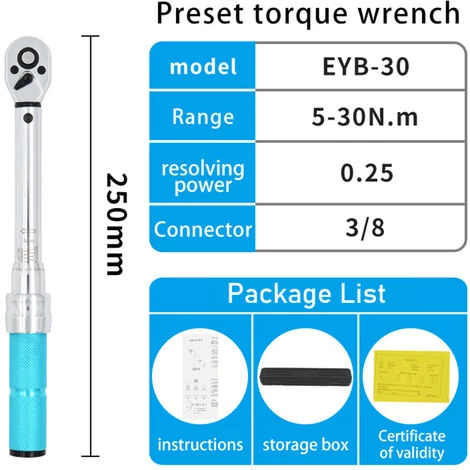 | E20571-30 | EYB-30 | 3/8″ | 5-30N.m | 250 mm / 9,84 pouces | 35 * 6 * 5 cm / 13,78 * 2,36 * 1,97 pouces | 648g / 1.43lbs |
