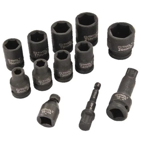 Composition : 9 douilles impact : 8 mm ½ », 10 mm ½ », 13 mm ½ », 14 mm ½ », 16 mm ½ », 17 mm ½ », 19 mm ½ », 21 mm ½ », 24 mm ½ ».