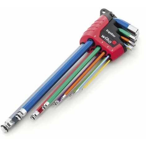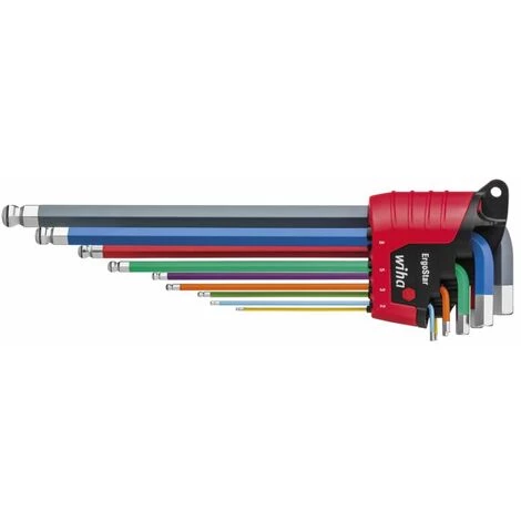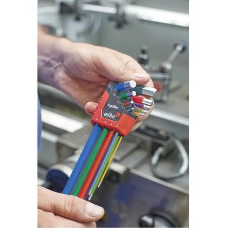 Wiha Jeu de clés ErgoStar couleur Magic Ring Application: Convient pour visser toutes les vis hexagonales et soulever des vis standard encastrées ainsi que l’insertion et la vissage des trous aveugles horizontaux, obliques ou profonds. Qui ne sait pas çaPour de nombreuses rides de stylos, il est lourde pour éliminer les clés individuelles ou retourner au support. Mais le Wiha Ergostar se termine maintenant, car il résout ce problème de manière génie. La rotation d’une seule touche PIN dans le support provoque toutes les autres touches de tourner sur le côté au même angle et permet une suppression rapide et confortable. Un serrage dans les supports garantit que les clés ne peuvent pas tomber lorsque le support est fermé. De plus, les clés à broches colorées sont rapidement et facilement trouvées et grâce à la laque que dans le noir avec la lumière UV peuvent être bien trouvées. Ainsi, la durée de recherche est réduite de la clé à goupille perdue et d’attendre que les plantes réduisent le risque d’outils oubliés dans la machine. Grâce à la fonction de maintien de MagicRing® avec anneau en acier à ressort, le stylo raccore toutes les vis de fixation hexagonales sans aimant dans chaque couche parfaitement serrée. La tête de boule hexagonale permet une vissage sans effort sous un angle allant jusqu’à 25 degrés. L’ensemble de touches PIN contient neuf clés de stylo hexagonaux de couleur dans des tailles communes. titulaire 1x ErgoStar